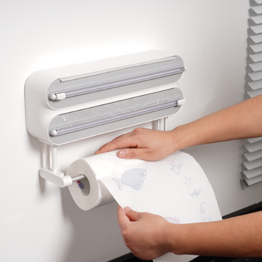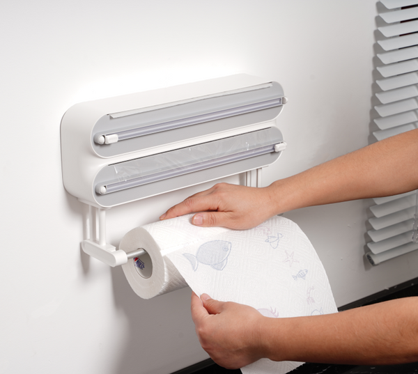 Papel film, papel aluminio, toallas y más en un solo organizador de pared. ¡Ahorra espacio y gana comodidad! 🏡