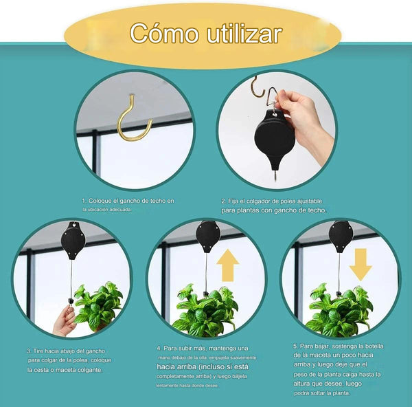 Nuestro juego de poleas para plantas está equipado con un mecanismo de elevación ajustable que le permite subir y bajar los artículos colgantes de su jardín con precisión y facilidad.